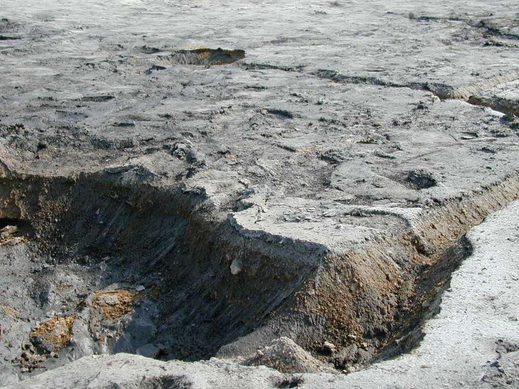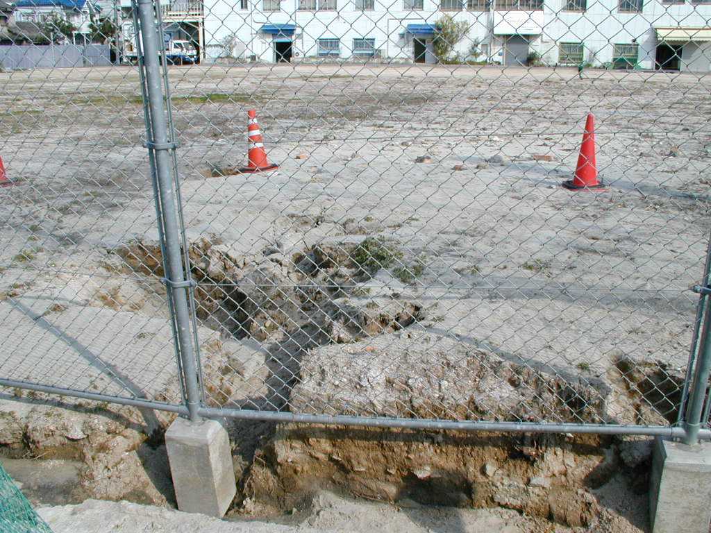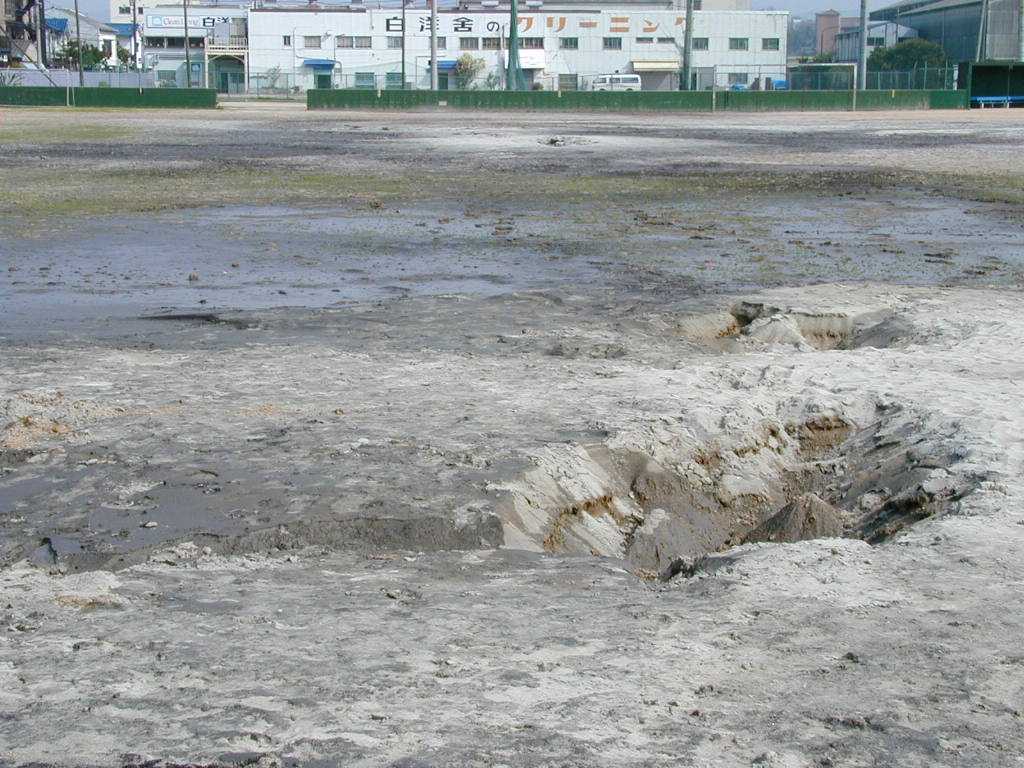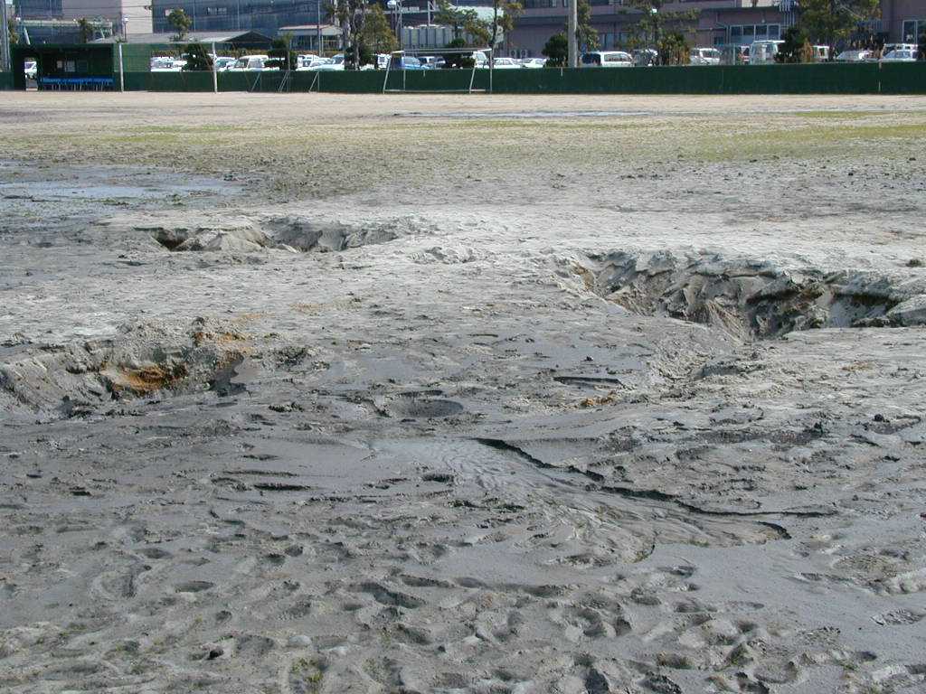 広島市西区 観音新町三菱重工グランド3 液状化跡 噴砂孔が大きく、深いのが特徴。 |
