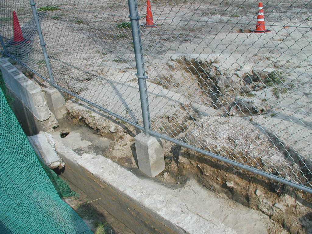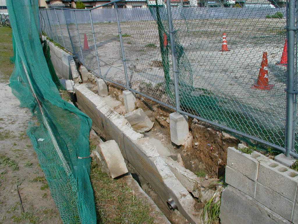広島市西区 観音新町三菱重工グランド横1 液状化によるコンクリートブロック壁の崩壊 |
