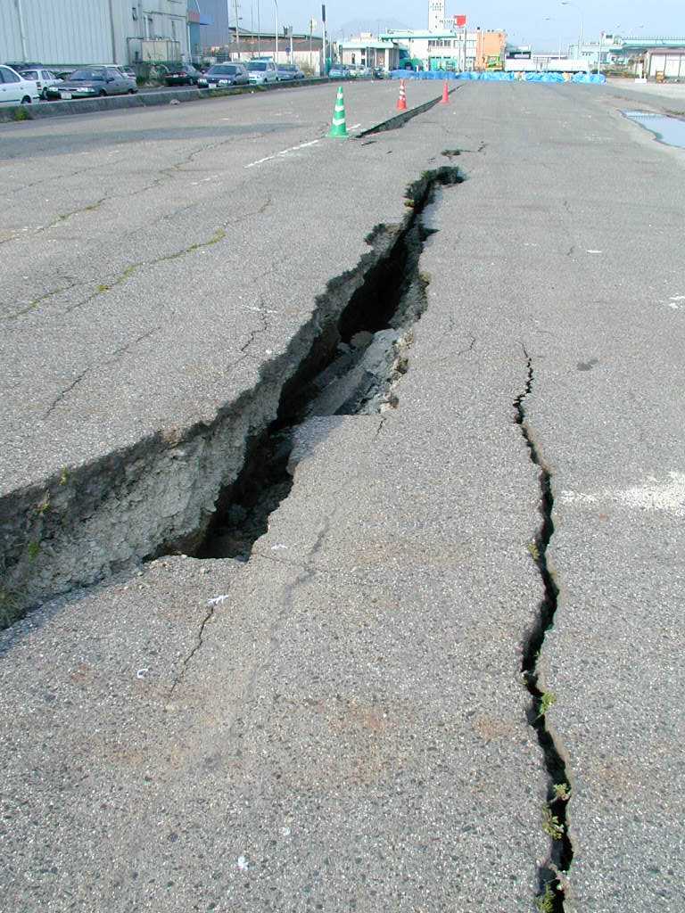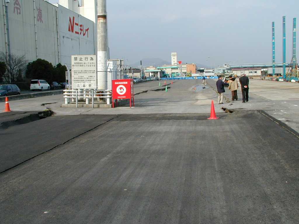 広島市西区 草津港1 岸壁エプロン背後地盤の沈下と亀裂 岸壁自体には被害はなく、移動もしていない。 (右手側が海) |