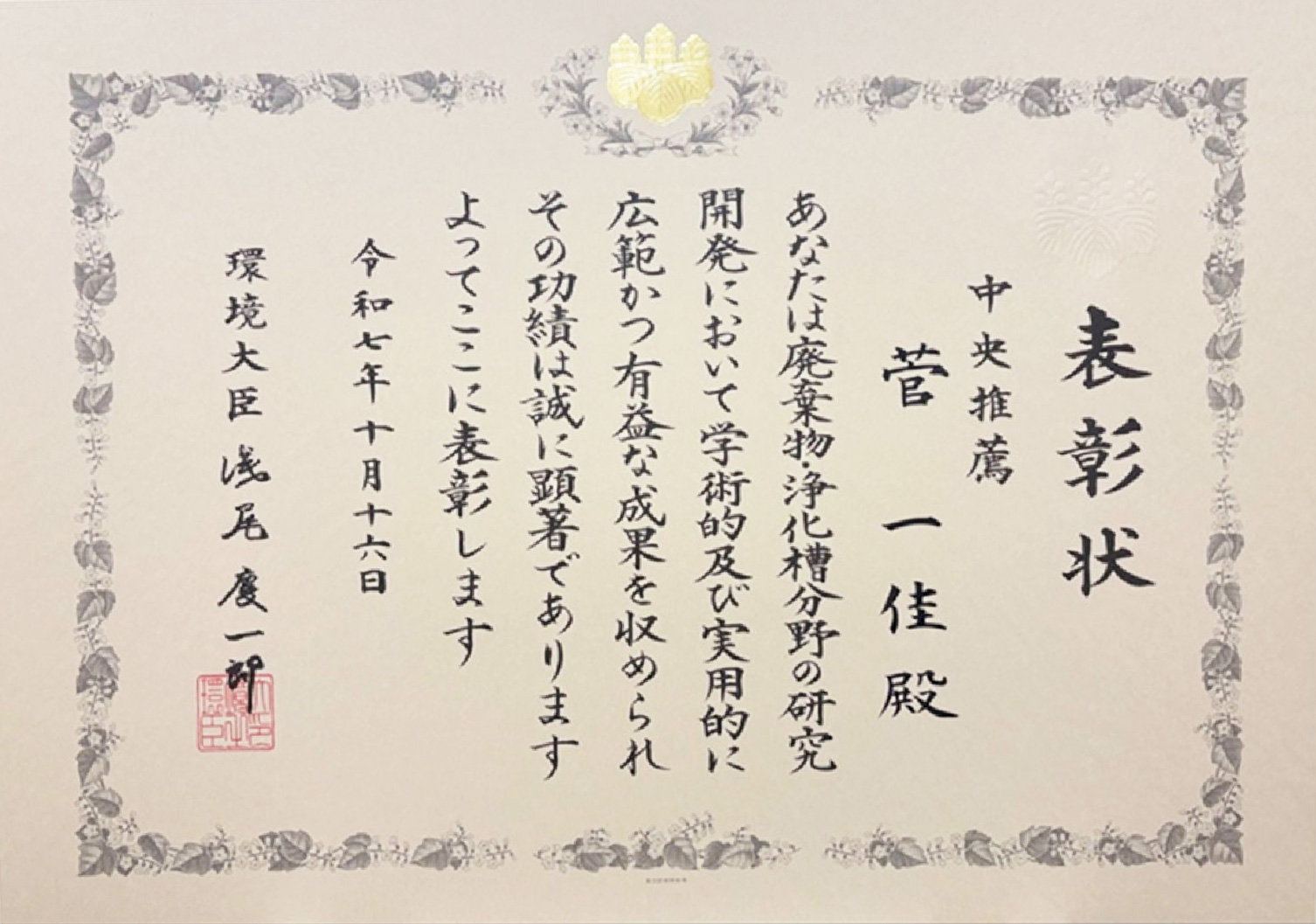 2025年10月16日(木)、株式会社エイト日本技術開発(EJEC)の菅一佳(環境エネルギー事業部 上席技師長)が、令和7年度環境大臣表彰「廃棄物・浄化槽研究開発功労者」を受賞しました。 この賞は、廃棄物の発生抑制、資源の循環利用、適正処分、または浄化槽によるし尿・生活雑排水の適正処理などの研究開発において、学術的および実用的に、広範かつ有益な成果を上げ、産業発展や社会貢献に顕著な功績をもたらした研究者・技術者に与えられるものです。 今回、菅が35年以上にわたり、廃棄物処理施設の整備や災害時の対応に取り組み、GISやドローン測量、AI画像解析など最新技術を活用して効率化を実現した点、東日本大震災や福島の中間貯蔵施設事業にも技術支援を行い、迅速な災害廃棄物処理を推進した点、さらに、業界の技術向上と人材育成にも尽力した点、などが高く評価され受賞しました。 EJECは今後も、技術者一人ひとりが日々の業務を通じて技術の研鑽と蓄積に励み、菅に続く優れた技術者を一人でも多く輩出できるよう、企業の持続的成長と人材育成に取り組んでまいります。