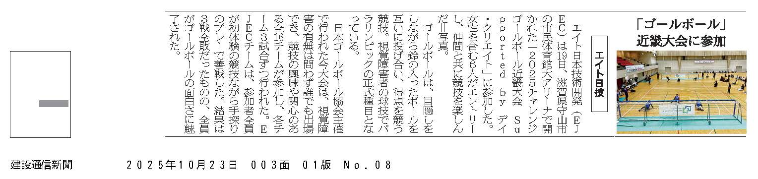 2025年10月19日(日)、一般社団法人日本ゴールボール協会主催による「2025チャレンジゴールボール 近畿大会 Supported by ディ・クリエイト」が守山市民体育館(滋賀県守山市)で開催され、エイト日本技術開発(EJEC)関西支社の有志6名で結成したチームで参加しました。