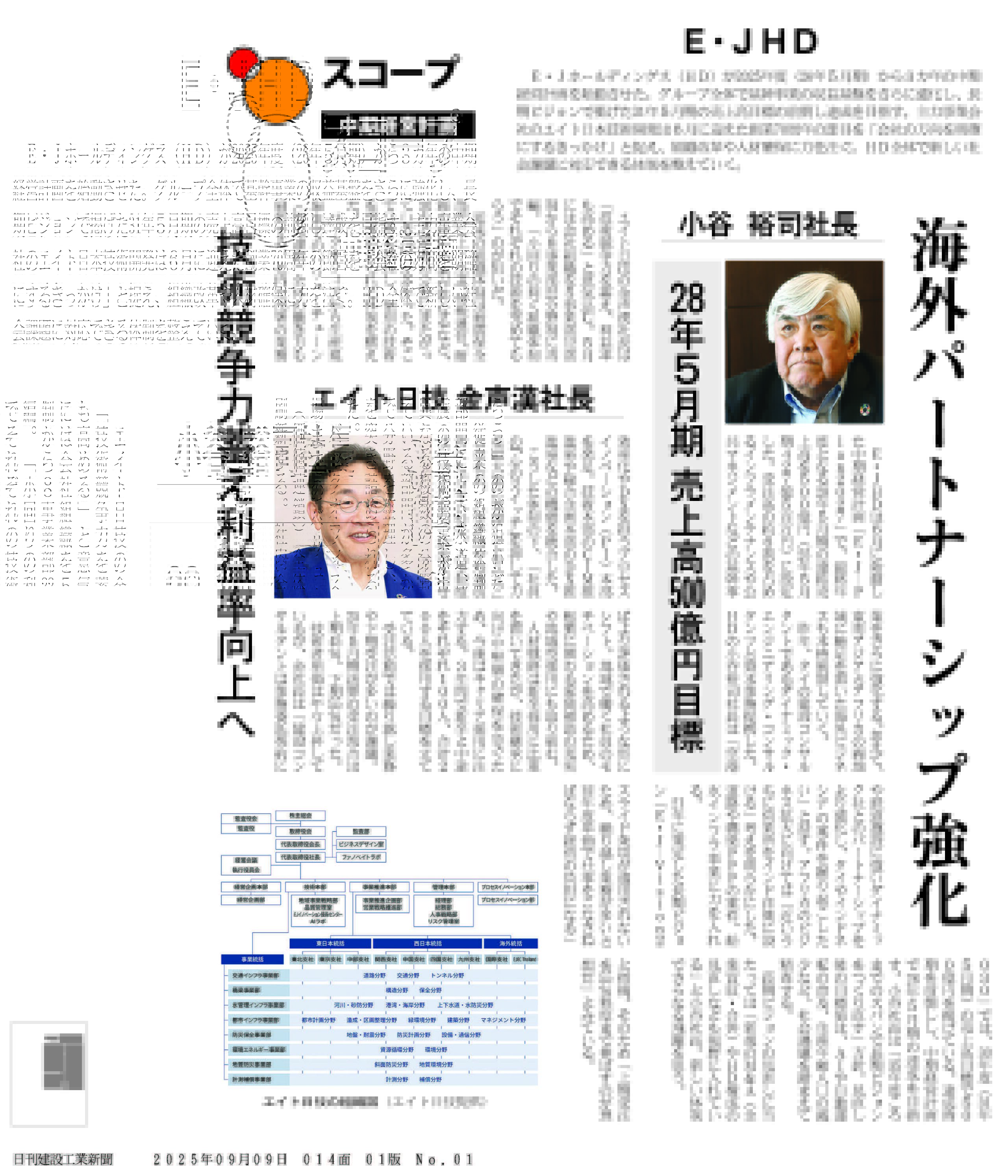 E・Jホールディングスと株式会社エイト日本技術開発(EJEC)がそれぞれ策定した3カ年の中期経営計画について、日刊建設工業新聞のインタビュー記事として掲載されました。 グループ全体で基幹事業の収益基盤をさらに強化すること、EJEC組織改革や人材確保に力を注ぎ、技術競争力を蓄えていくことなどを計画しています。