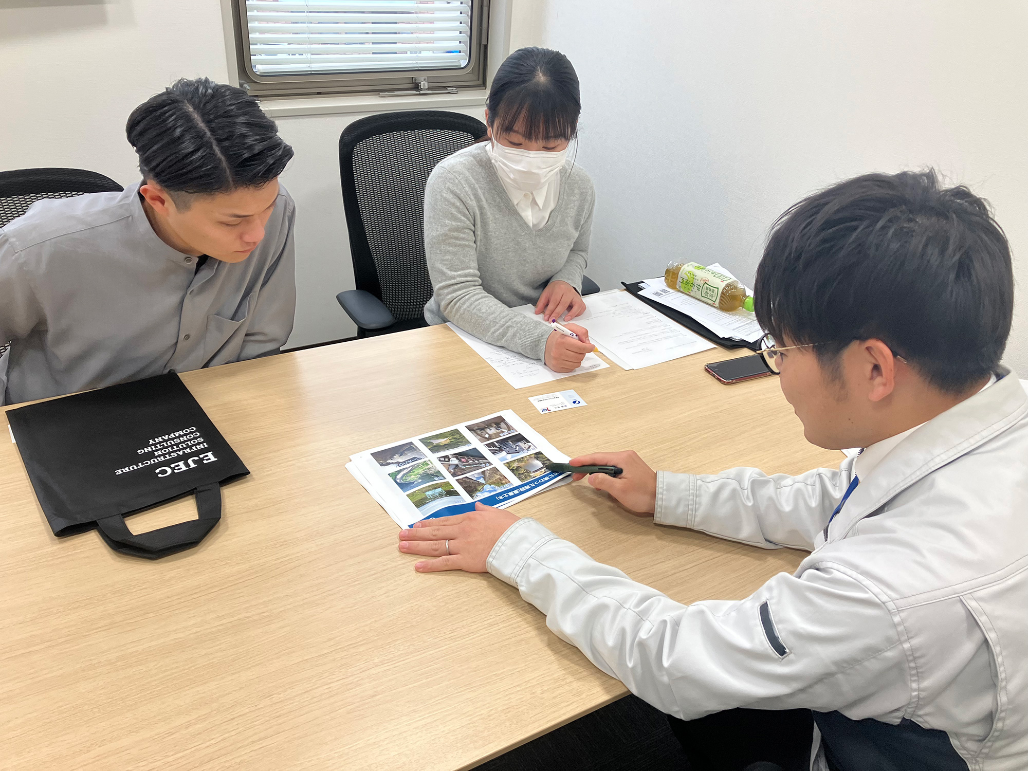 インタビューに応じたのは、現在河川・砂防分野に所属する田淵です。「ため池廃止」などの業務の流れなどについて紹介し、業務の幅広さや地域社会に貢献する仕事の魅力について伝えました。