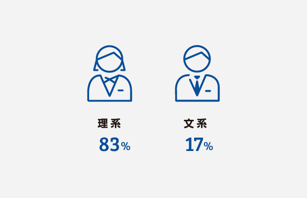 土木技術を中心とした技術サービス業であるため、人員構成は技術系が8割以上を占め、理系出身社員が多い構成となっています。
