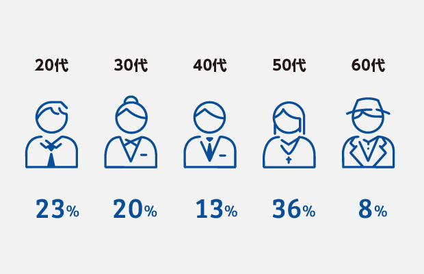 平均年齢は約40歳です。近年は若手社員の入社が増加し、20代の比率が上がってきています。また、当社は高年齢者雇用安定法改正の以前より65歳定年制であるため、60代でも働き続けられる環境です。