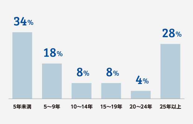 近年の新卒採用者、中途採用者の増加により、勤続5年未満の割合が多いですが、入社3年までの社員の離職率は4%程度です。一方で、入社から20年以上勤続中の社員も多く、長く働ける環境です。平均勤続年数は約15年。