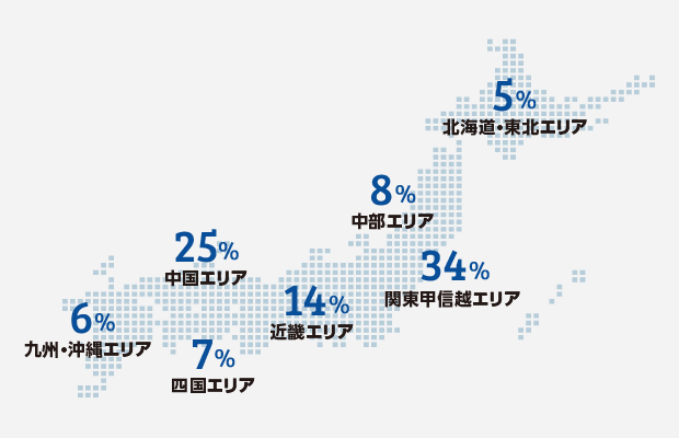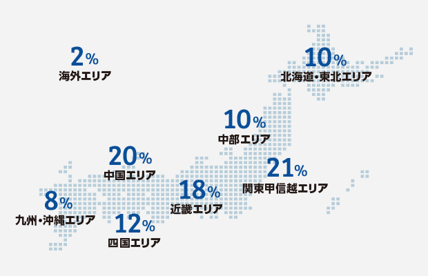 全国バランスよく業務を実施し、総合力を発揮しています。技術職を配置する拠点は、北から仙台、東京、さいたま、名古屋、大阪、神戸、岡山、広島、鳥取、松江、浜田、山口、徳島、高知、松山、福岡の16拠点です。