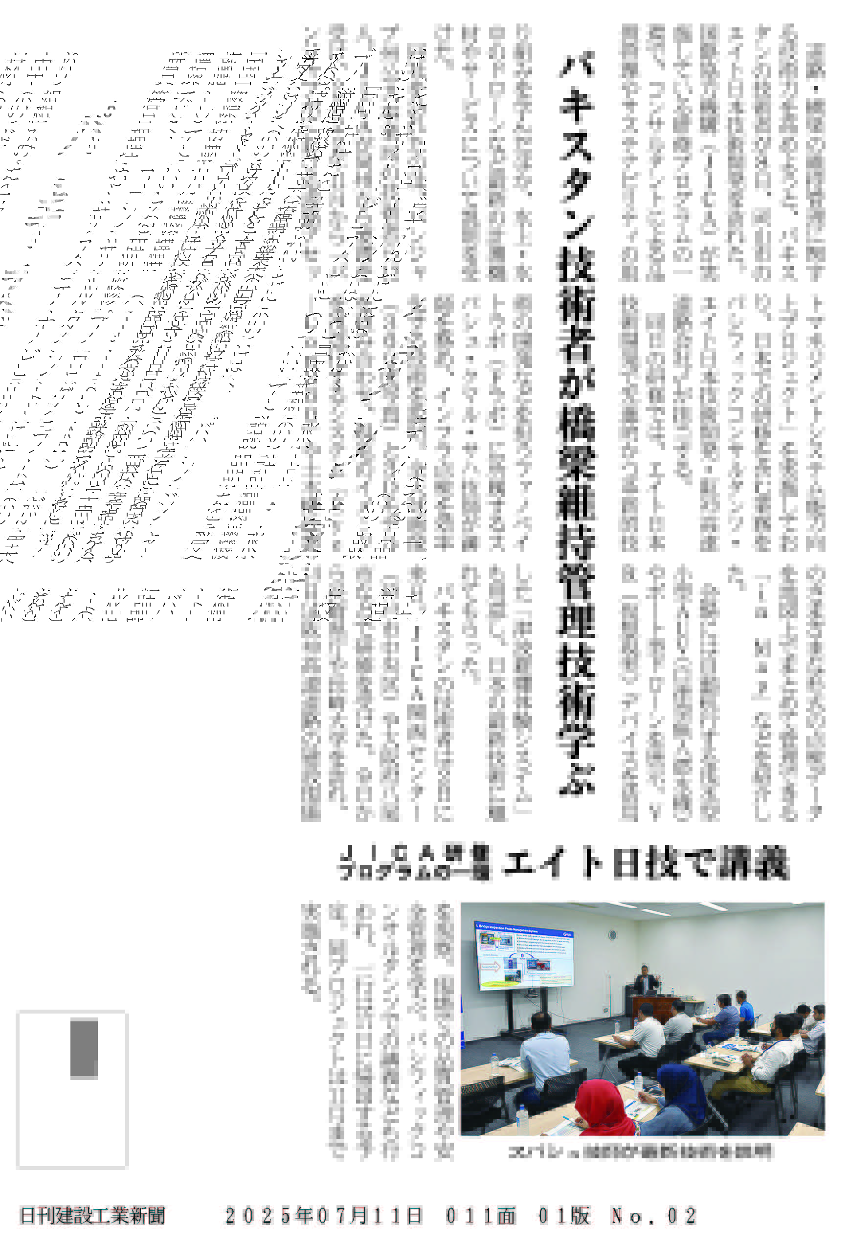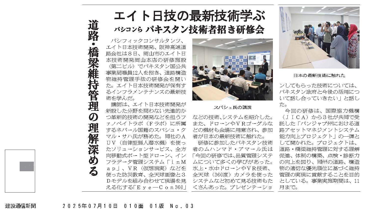 7月8日(火)、株式会社エイト日本技術開発(EJEC)の研修施設「Nibiru」(岡山県岡山市)に、パキスタン国パンジャブ州公共事業局の技術職員12名を招き、座学と体験を交えた研修会を開催しました。EJECの橋梁等インフラ維持管理に関する調査点検技術、ドローンやロボットなどの計測機器、データ管理やVR活用などの各種システムについて説明しました。この様子が建設専門紙に掲載されましたのでご紹介します。