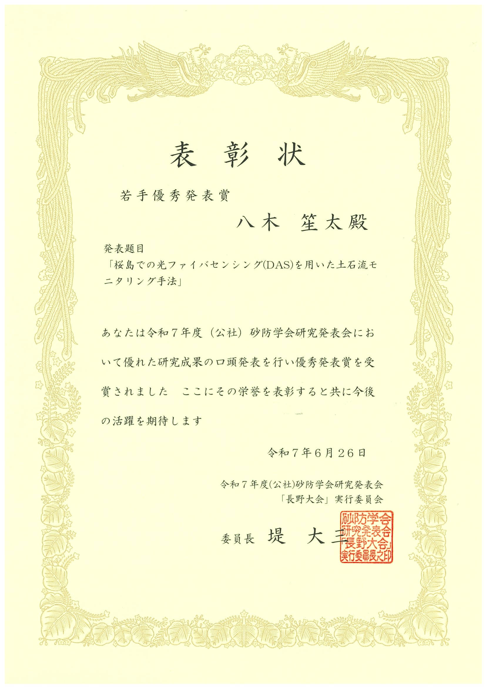 6月26日(木)、令和7年度(公社)砂防学会「長野大会」若手優秀発表賞の受賞者が発表され、株式会社エイト日本技術開発(EJEC)の八木が「優秀発表賞」を受賞しました。