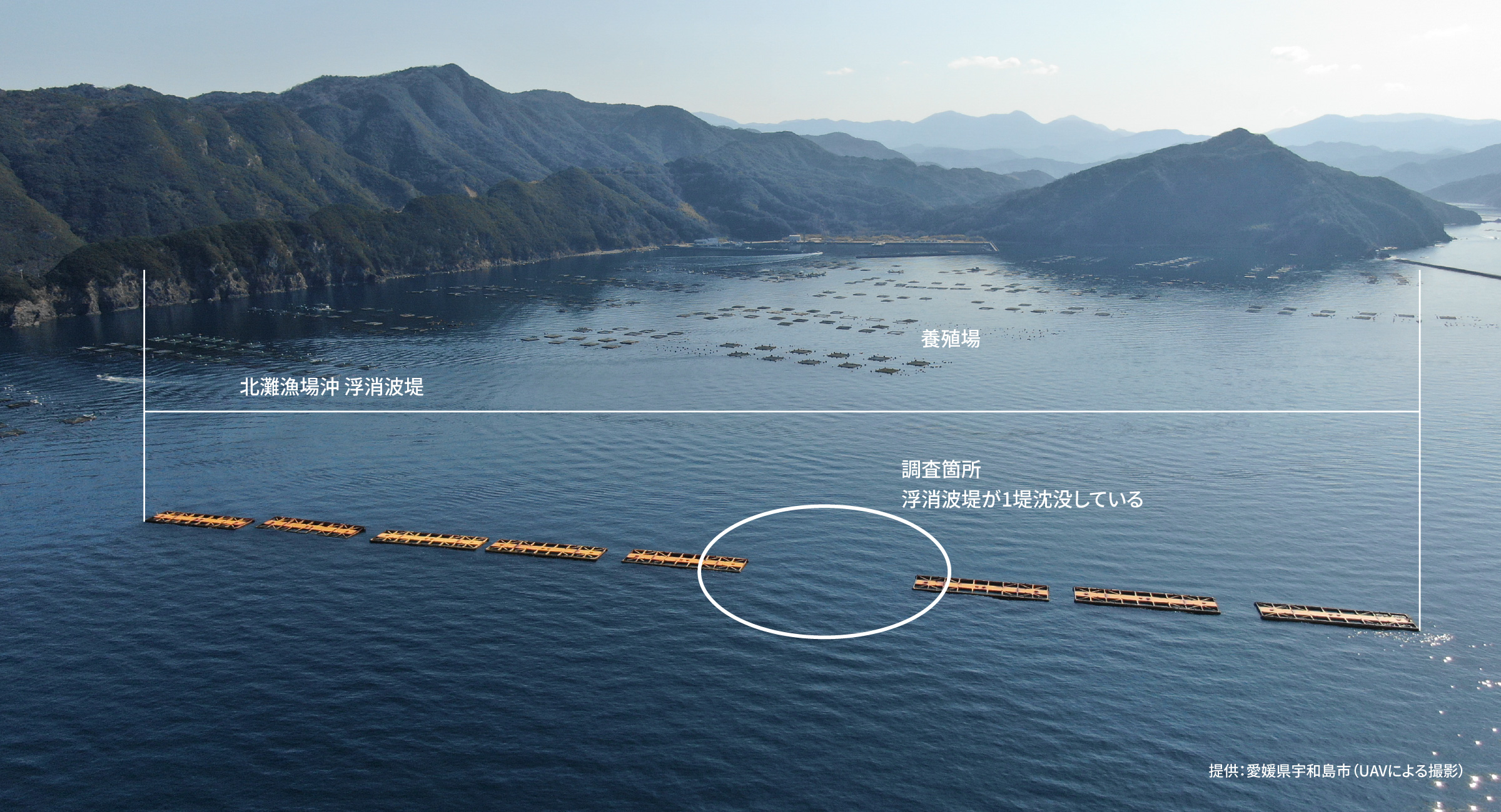 愛媛県宇和島市津島町北灘地区には、豊かな水産物の養殖場があります。沖合には浮消波堤が整備されていますが、その一つが沈没していたため、水中ドローンによる確認調査を実施しました。