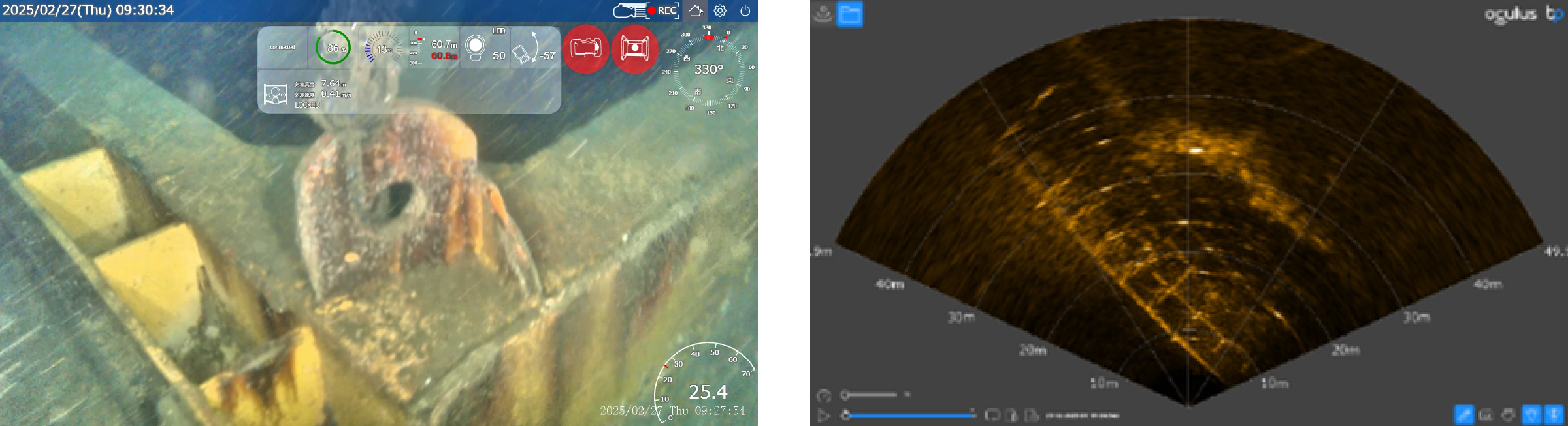 水深70m付近に沈没した浮消波堤 動画(左)とソナー映像(右)