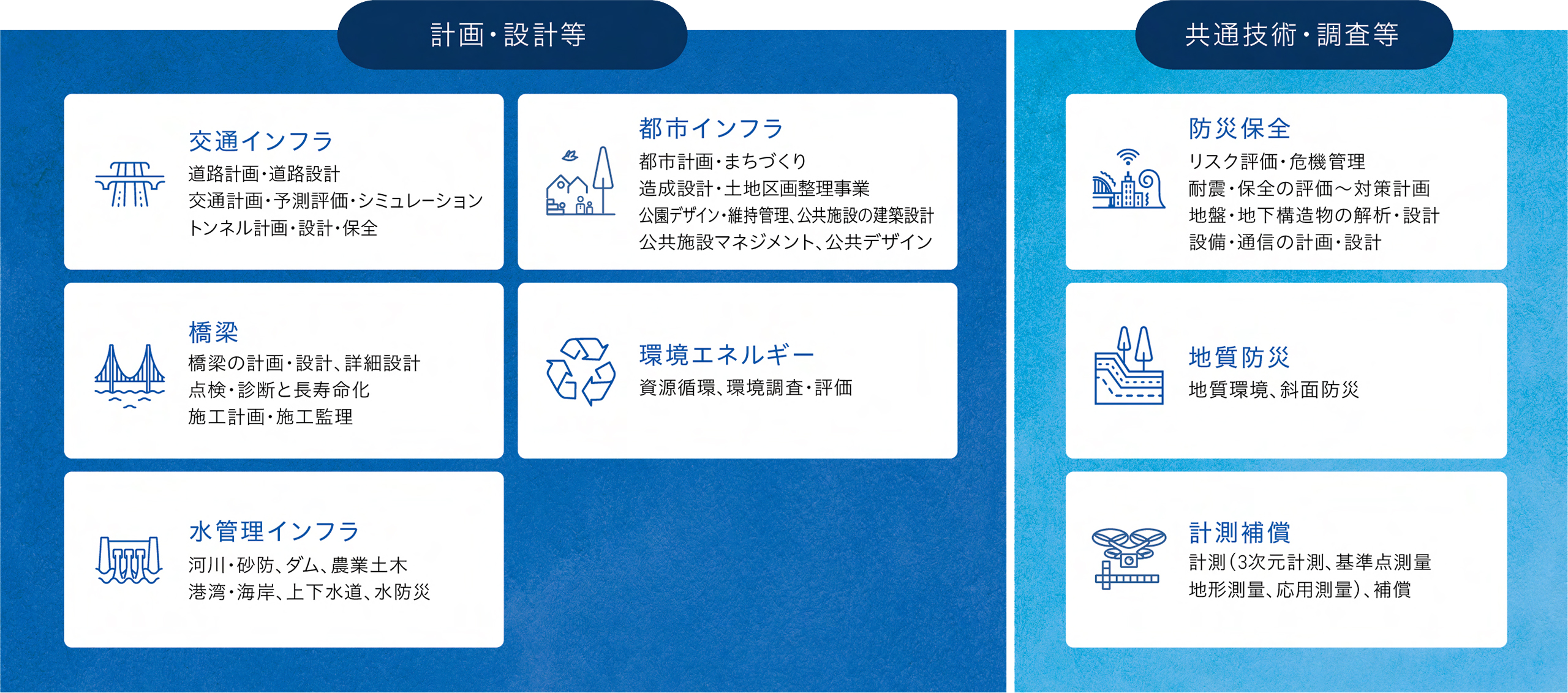 インフラ整備やまちづくりは、地域の歴史や人々の暮らしと自然の性質を理解し、そこにあるべき理想的な関係をプロデュースしていくことです。安全性を第一としながらも、歴史と文化になじむ姿、まちのにぎわいを未来につなげるしかけ、そうした視点を踏まえた技術を提供していきます。